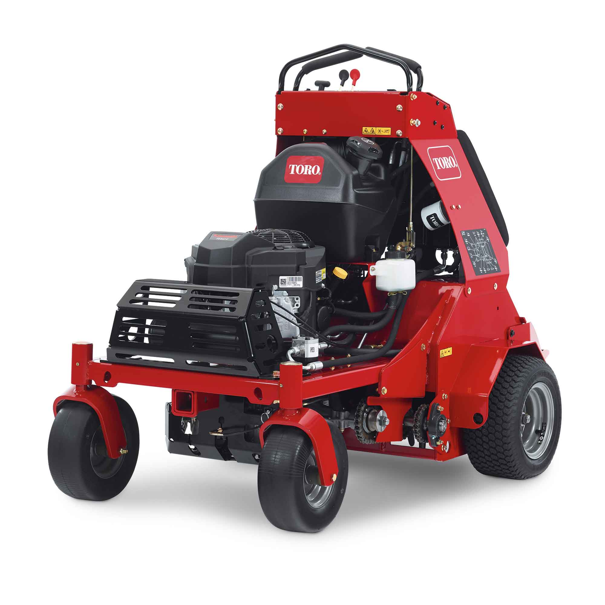 The 30″ stand-on model boasts a powerful Kawasaki V-Twin engine with integrated hydraulics that follow the contours of the ground to pull even plugs over hills and soft ground. It applies up to 1,200 lbs. of down pressure on the tines to pull up to 5″ cores, and operators can finely tune the hydraulic system to pull any length of plug on the fly. Electronic foot pedal controls also allow the operator to raise and lower the tines instantly for quick zero-turn maneuvers without taking their hands off the controls. In addition, the floating operator platform isolates the operator from vibrations for an exceptionally smooth ride.